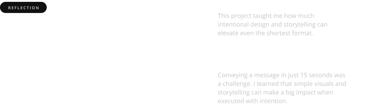 Timing Is everything with just 15 seconds, every moment was paced to the beat for impact, with smooth transitions and clear visuals keeping it engaging and easy to follow. Keeping it simple with a clean and minimal design made the message easy to digest at a glance.