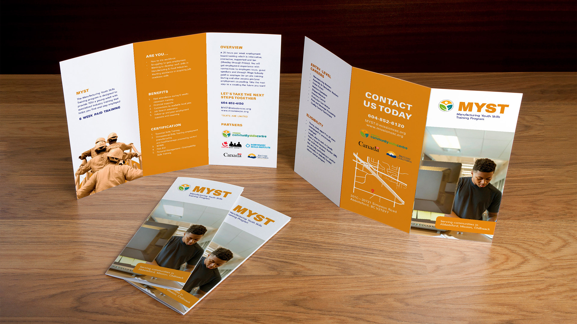 Two different approaches for a re-design of a brochure for MYST. A youth skills training program specializing in supporting young adults into the manufacturing workforce.