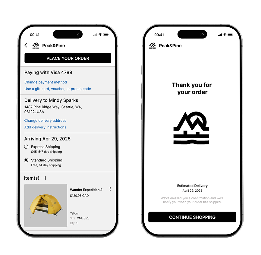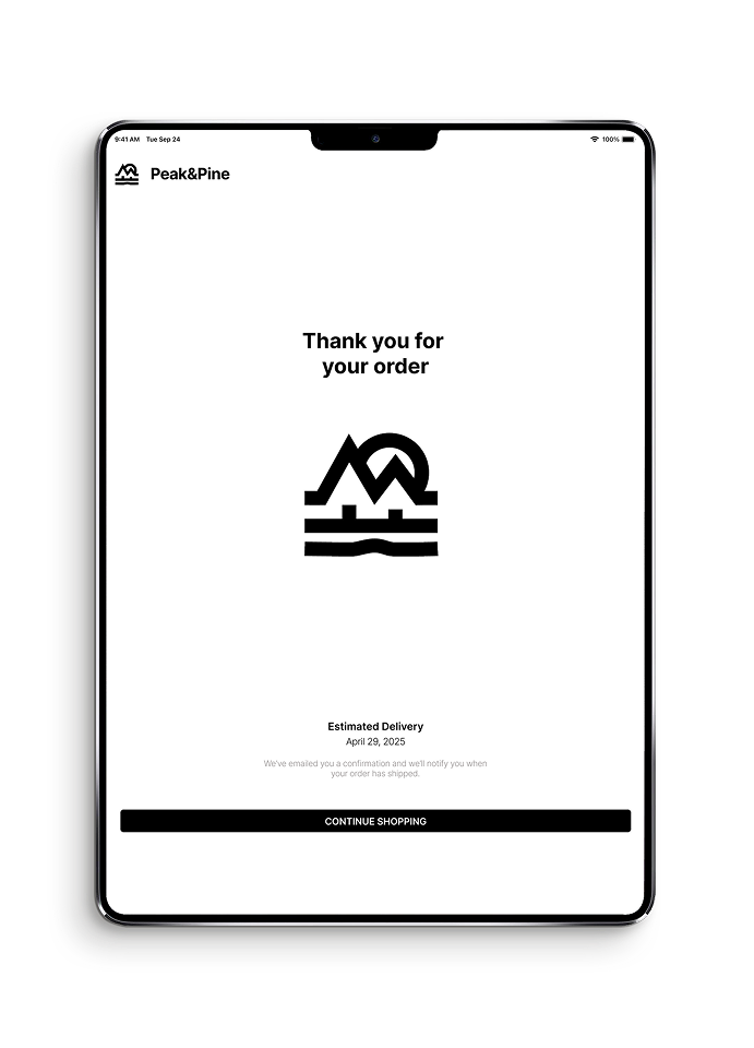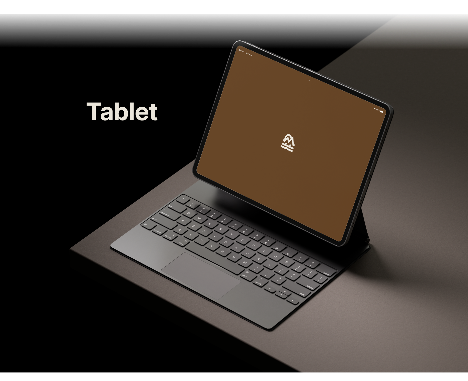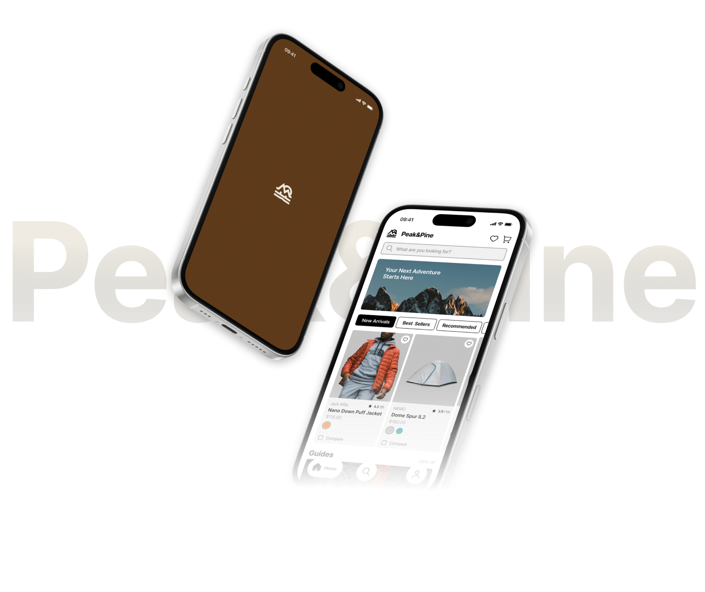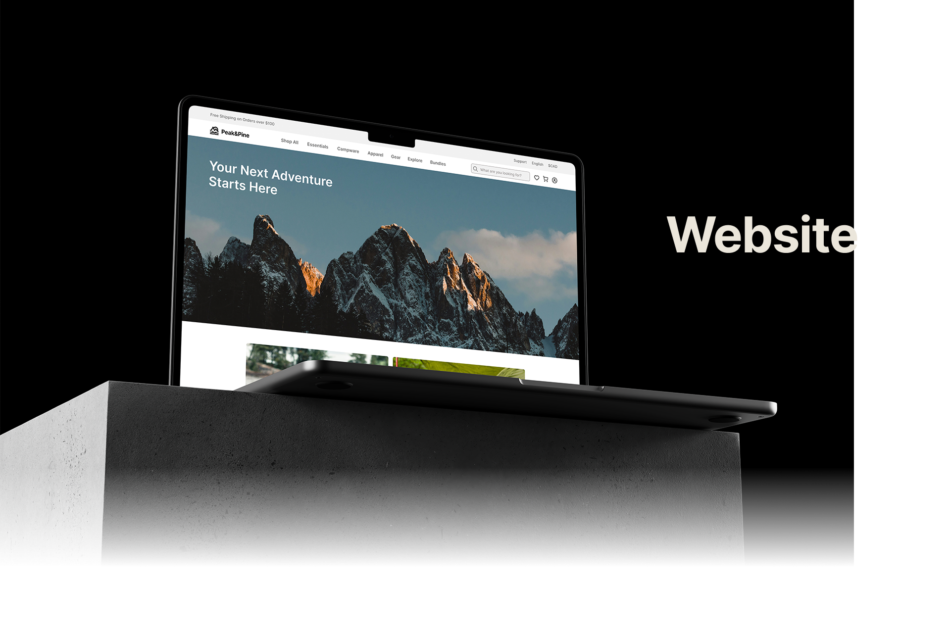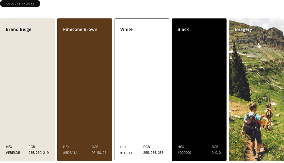 The rich pinecone brown grounds the brand in the outdoors, symbolizing resilience and warmth. A soft beige adds balance and approachability, while black and white are used as supporting colours. Imagery is used to display products and create a vision of the lifestyle.