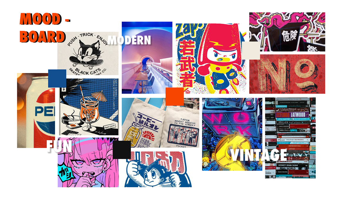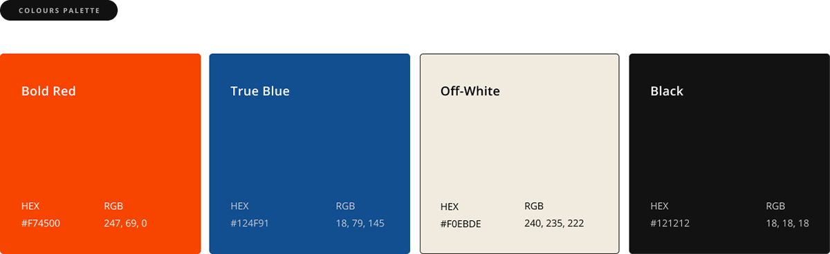 The bold blood-orange red and blue compliment it each while showing diversity and the soft off-white and black provide a neutral but nostalgic inviting tone without being too sharp and in your face. This in turn create a lively yet recognizable brand colours.